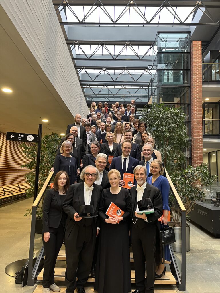 Tasan kello 12:15 vahtimestari avasi oven, ja me astuimme sisään. Yleisö nousi seisomaan. Kymmenet ystävälliset kasvot ottivat meidät vastaan, kun laskeuduimme portaat alas salin etuosaan. Kustos, professori emeritus Esa Saarinen, avasi väitöstilaisuuden, ja sain tehdä näkyväksi yli 12 vuoden ajattelun tuloksen: ”Arvoisa kustos, arvoisa vastaväittäjä, hyvät kuulijat…”